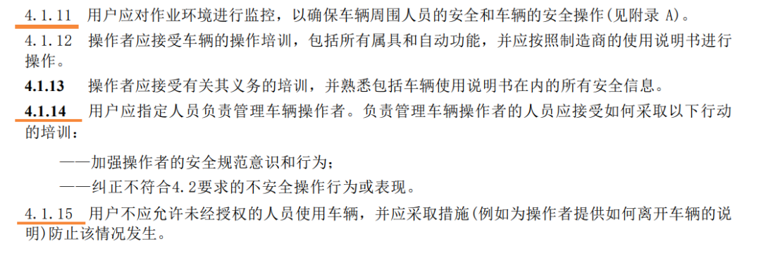 工业车辆使用、操作与维护的【一般要求】一共15个条目,与GB/T 36507-2018相比,增加了 用户对作业环境的监控、负责管理车辆操作者的人员的指定培训和 用户不应允许未经授权的人员使用车辆及采取措施的要求。