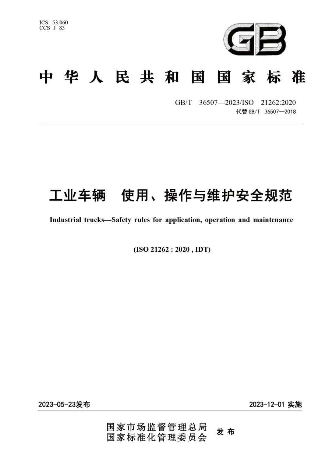 2023年5月23日,国家市场监督管理总局发布了GB/T 36507-2023《工业车辆 使用、操作与维护安全规范》,该标准已于2023年12月1日正式实施,代替GB/T 36507-2018的旧版本。