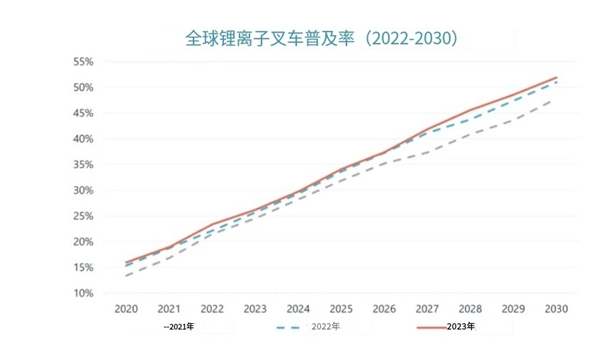 近年来,电动叉车需求激增,中国和欧洲一些国家的叉车电动化率最早将在 2025 年达到 50%。预计到 2030 年,锂离子叉车的全球市场份额将超过 50%,其中 3.1 类叉车将成为首个电动化率超过 50%的类别。