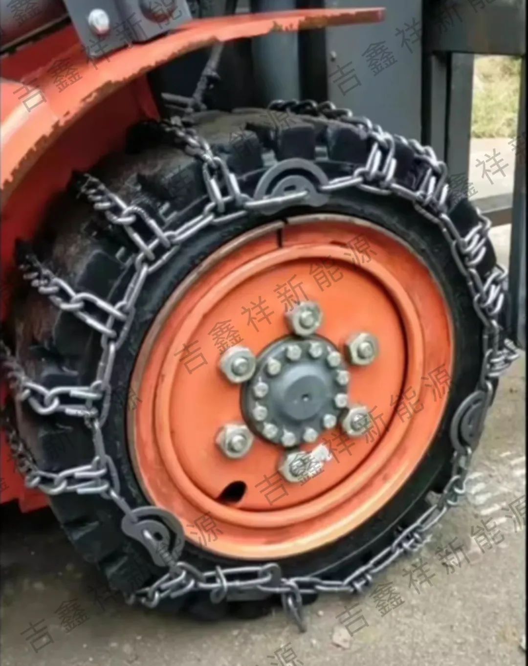 轮胎防滑链的作用就是在下雪天里加强车胎与地面的滑动摩擦力,比没有组装轮胎防滑链的车胎地面防滑效果好很多,安装防滑链后,一定要确保牵引车行驶速度不超过20Km/小时,叉车行驶速度不超过10Km/小时,而且尽可能避免突然加速、急刹车、急转弯和连续空转的情况,否则防滑链对轮胎造成一定的影响。其次,当驾驶在不需要使用防滑链的路面时,应立即停靠在安全的地方,然后将防滑链卸除出来。