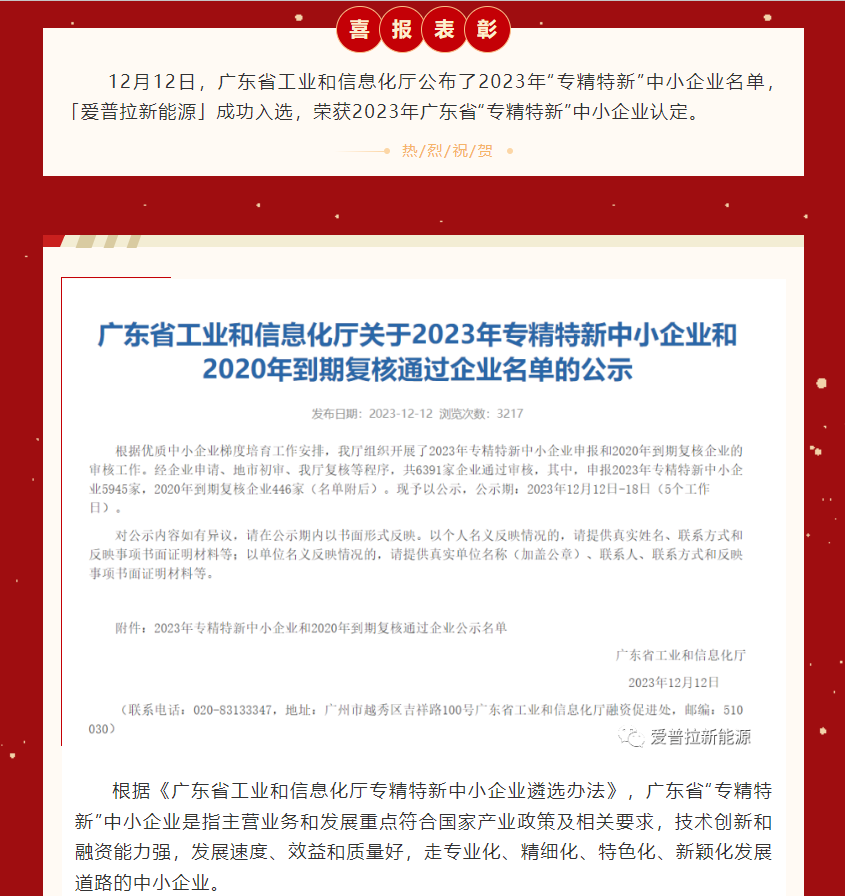 喜报|爱普拉新能源被认定为2023年“广东省专精特新”中小企业
