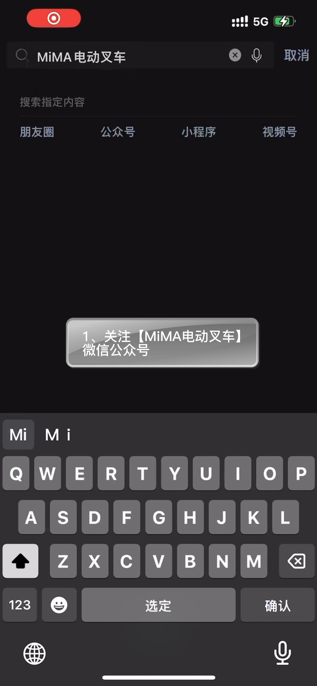 1、搜索【MiMA米玛电动叉车】微信公众号,关注公众号,点击进入