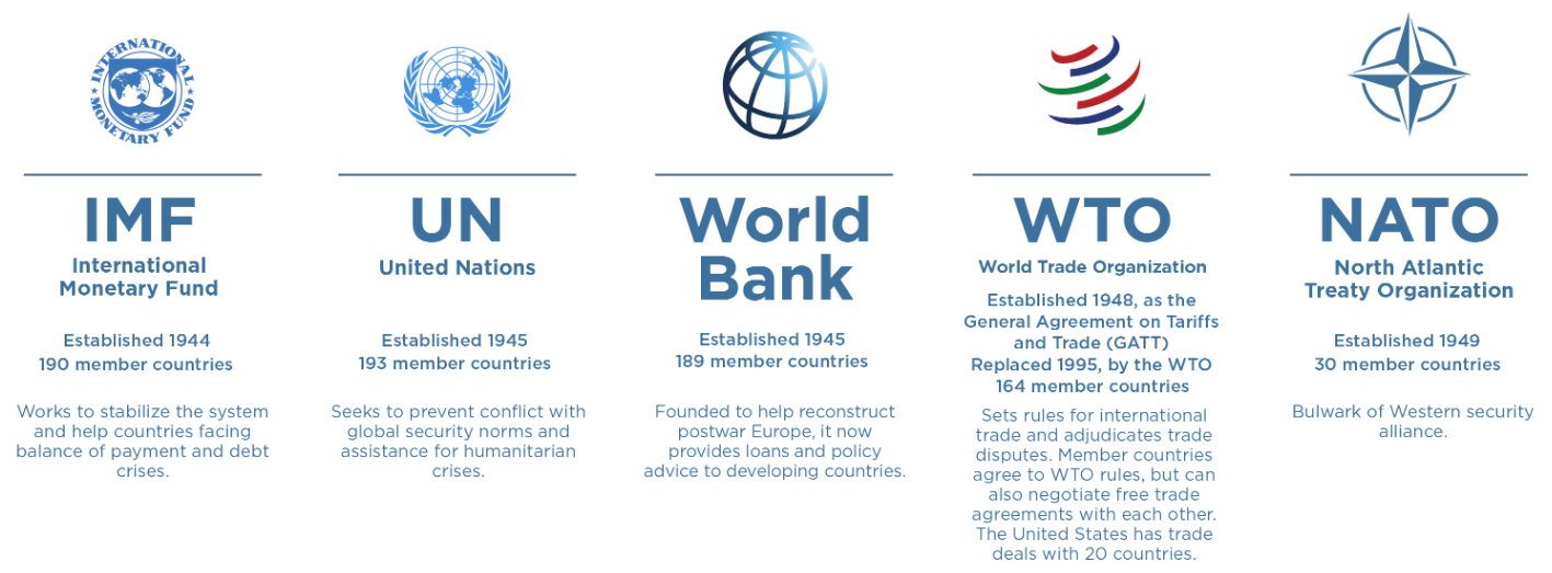 自由贸易和法治是该体系的支柱,有助于防止大多数经济争端升级为更大的冲突。设立的机构包括: