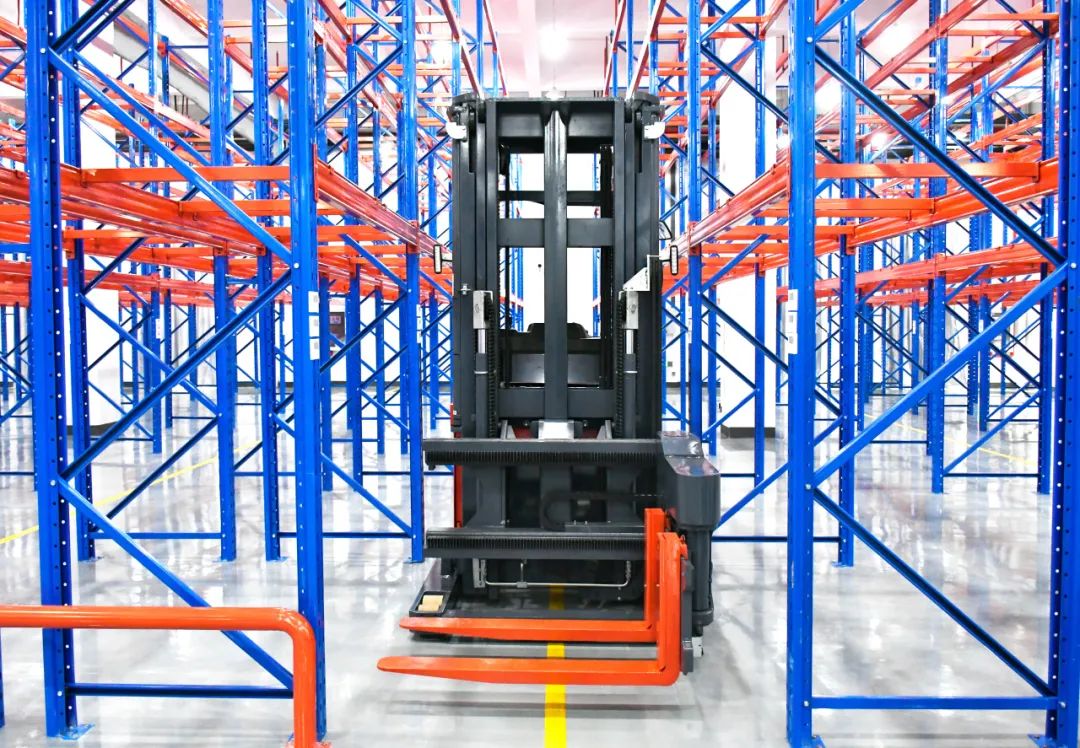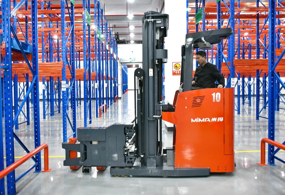 1、客户选购MiMA米玛1.0吨人下行三向堆垛车,车身宽度仅为1.45米,完全匹配客户现场的超窄巷道通行作业距离;
