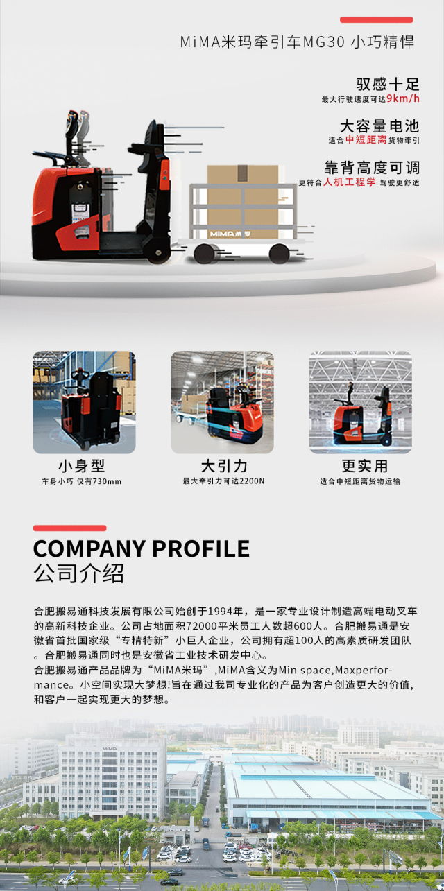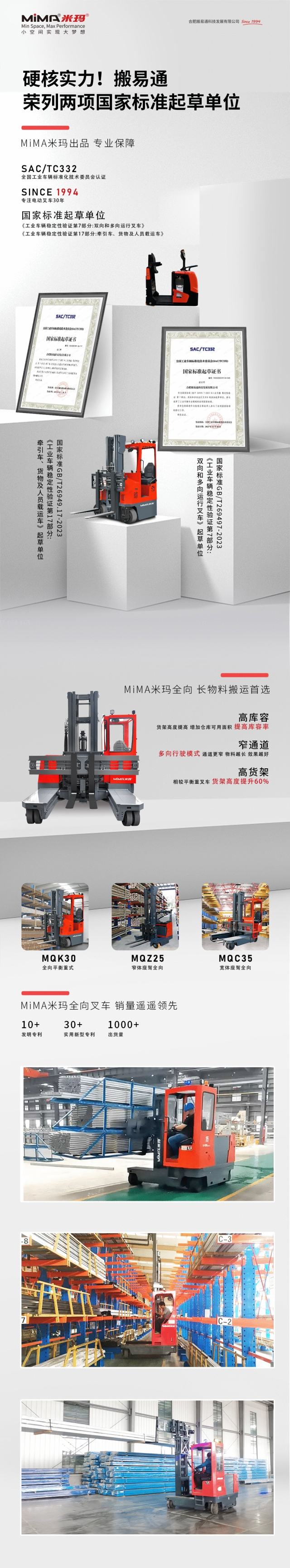 二十多年不断进取, MIMA 品牌以公司强大的科研创新团队为依托,以“安全、耐用、舒适、低碳(环保)”为设计理念,为客户提供500KG —100000KG应用解决方案、仓储设备及 相关服务。 通过不断的技术创新和专利积累,现在我们的产品已涉及12大类50多个品种,如电动托盘车搬运车、托盘堆垛车、前移式叉车、平衡重式叉车、牵引拖车、拣选车、窄巷道叉车、四向叉车、侧面叉车和非常物流设备、AGV、无人巷道堆垛机等等。产品广泛 应用于医药、食品、化工、电子、机械、家具、物流等各个行业。