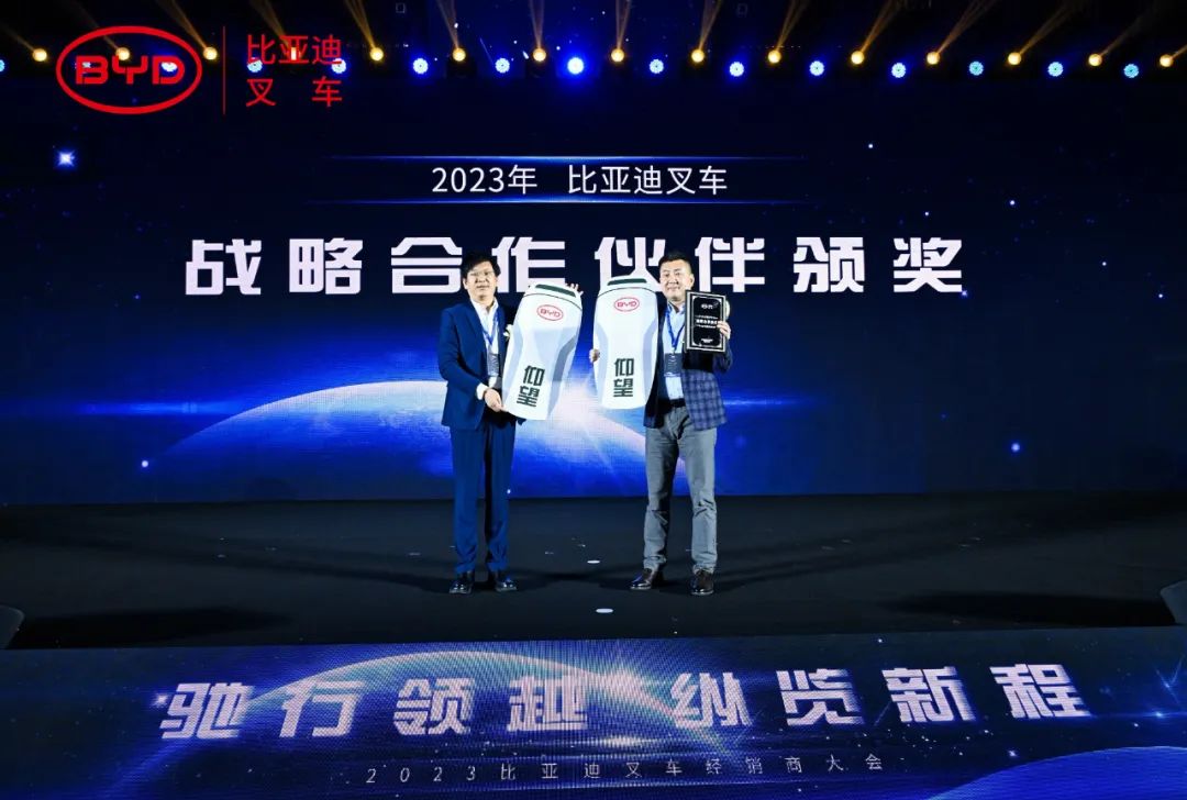 2023年比亚迪叉车蓬勃发展的道路上,我们得益于自身的不懈努力,也离不开一路携手并肩的伙伴们的支持,在前行路上我们凝心聚力,密切协作,为新能源叉车行业的发展提供了强有力的支撑,此次大会比亚迪叉车特授予广州佛朗斯股份有限公司战略合作伙伴奖。