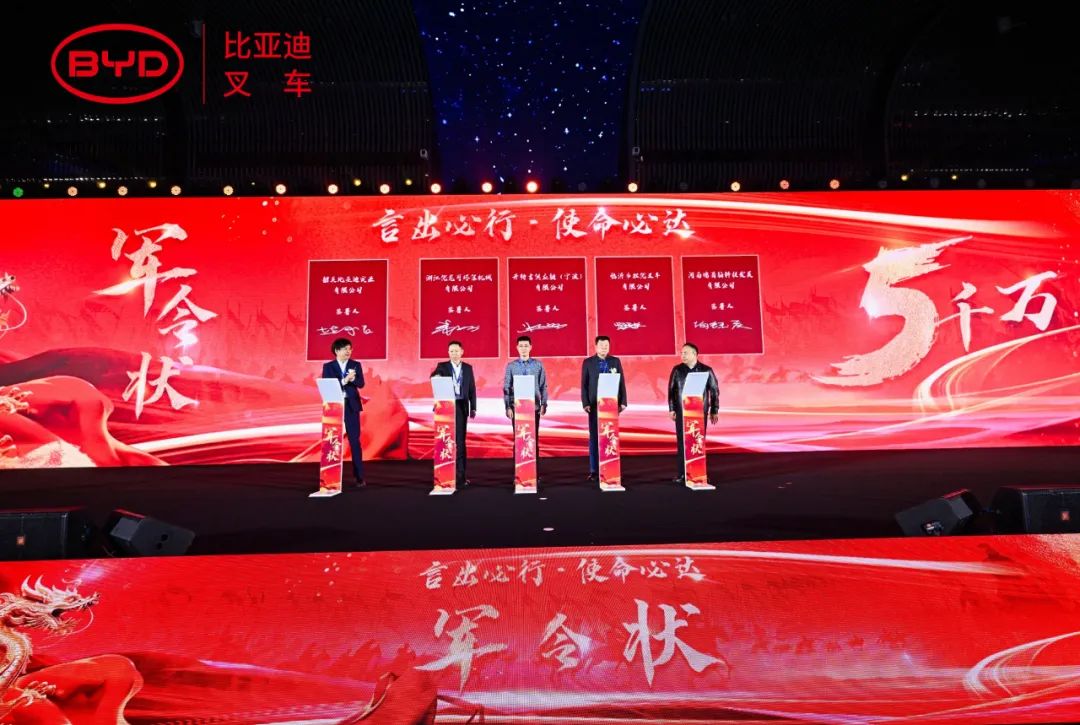 2024年已拉开序幕,在全体与会人员的见证下,毕总与多位经销商代表共同签订了新一年的销售目标,更加坚定了大家齐心共赢的信念,也预示着比亚迪叉车2024年定将宏图大展,开启新的篇章。