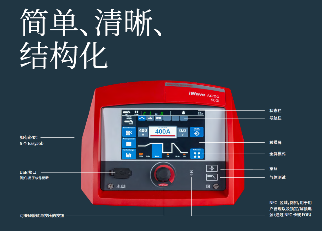 高质量的手工焊接要求焊工具有多年的经验和操作技巧,氩弧焊尤为如此。焊接系统的操作越是直观便捷,焊工就越能更好地专注于实现优质的焊接效果。iWave的动态可视化操作面板能够让焊工的工作变得更加轻松。该设备的菜单导航清晰明了,并支持30多种语言选择,即使焊工戴着手套也能轻松操作触摸屏。