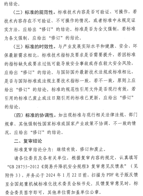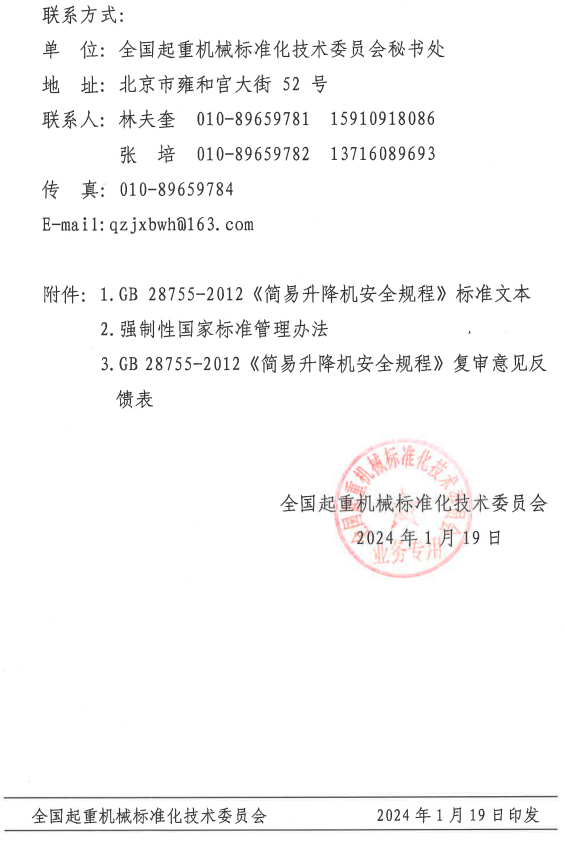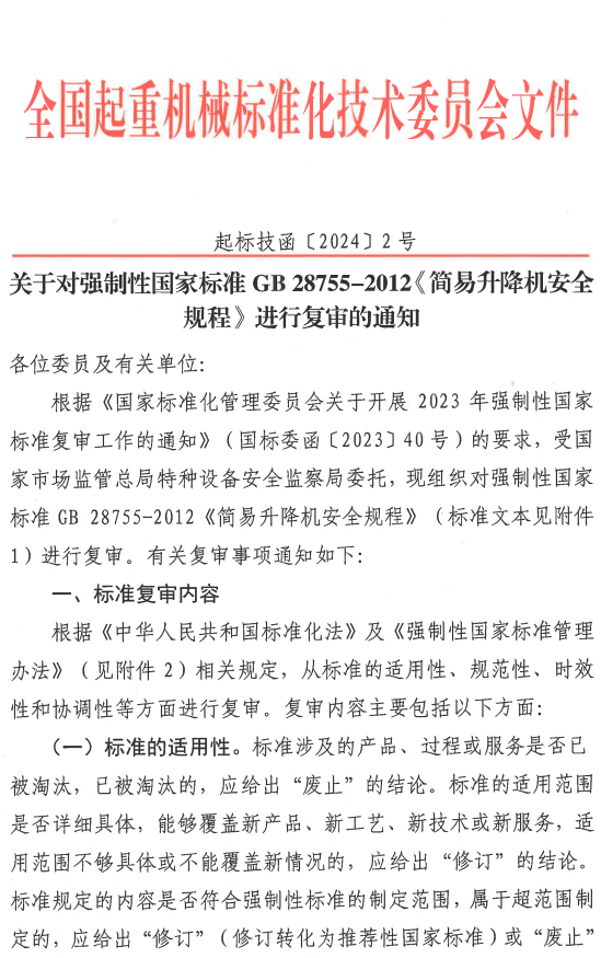 关于对强制性国家标准GB 28755-2012《简易升降机安全规程》进行复审的通知
