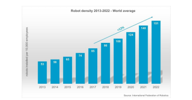 德国法兰克福,2024 年 1 月 10 日 —在大量工业机器人安装的推动下,全球将在 2022 年创下 390 万台操作机器人的新纪录。按机器人密度衡量,自动化程度最高的国家是: 韩国(每个国家拥有 1,012 台机器人) 10,000 名员工)、新加坡(730 家)和德国(415 家)。这是根据 IFR 发布的《2023 年世界机器人》报告得出的结论。