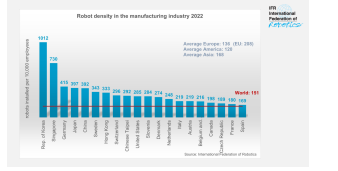 中国在 2021 年上升至第五位,并在 2022 年保持这一地位。尽管制造业拥有约 3800 万人的庞大劳动力,但中国对自动化技术的大规模投资使得机器人密度高达每 10,000 名员工 392 台机器人。