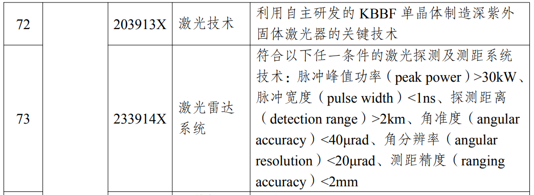 但是,在最新《目录》中,有一项名为“激光雷达系统”的技术被列入限制出口部分,对该项“激光雷达系统”技术的控制要点描述为: