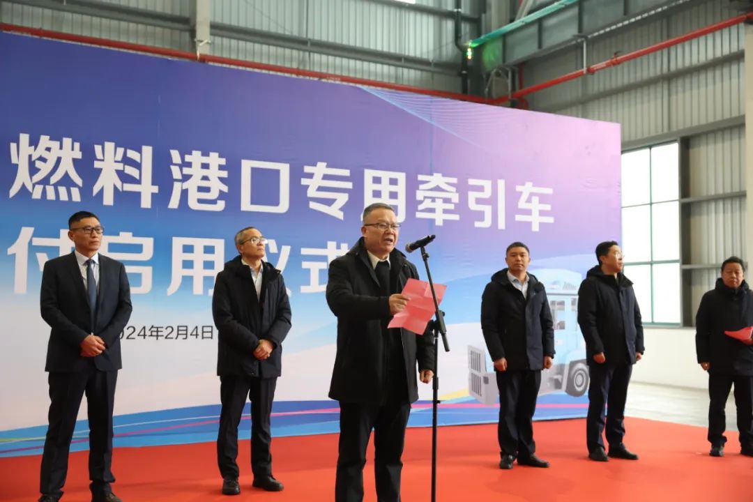 集团公司詹董事长在致辞中首先向参与产品研制的合作单位表示衷心感谢,向集团相关单位、部室的探索攻坚表示诚挚慰问。他指出,首批氢燃料港口专用牵引车的成功交付是集团秉持绿色发展理念、推进作业机械清洁化的创新探索和生动实践,希望使用单位尽快熟悉并用好新装备,充分发挥新设备性能和新装备效能;希望合作方持续提供技术支持并深入研发更多氢能源产品,携手打造港口高质量发展的“绿色引擎”;希望集团上下始终坚定“绿色五化”发展路径,作出更多敢为人先的新探索、新实践。