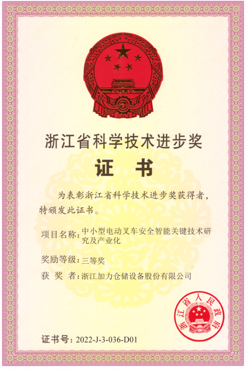 “中小型电动叉车安全智能关键技术研究及产业化”项目荣获省级科学技术进步奖三等奖。