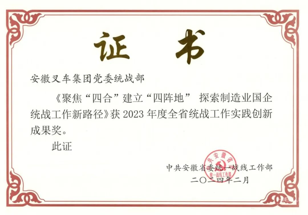 安徽叉车集团喜获2023年度全省统战工作实践创新成果奖!
