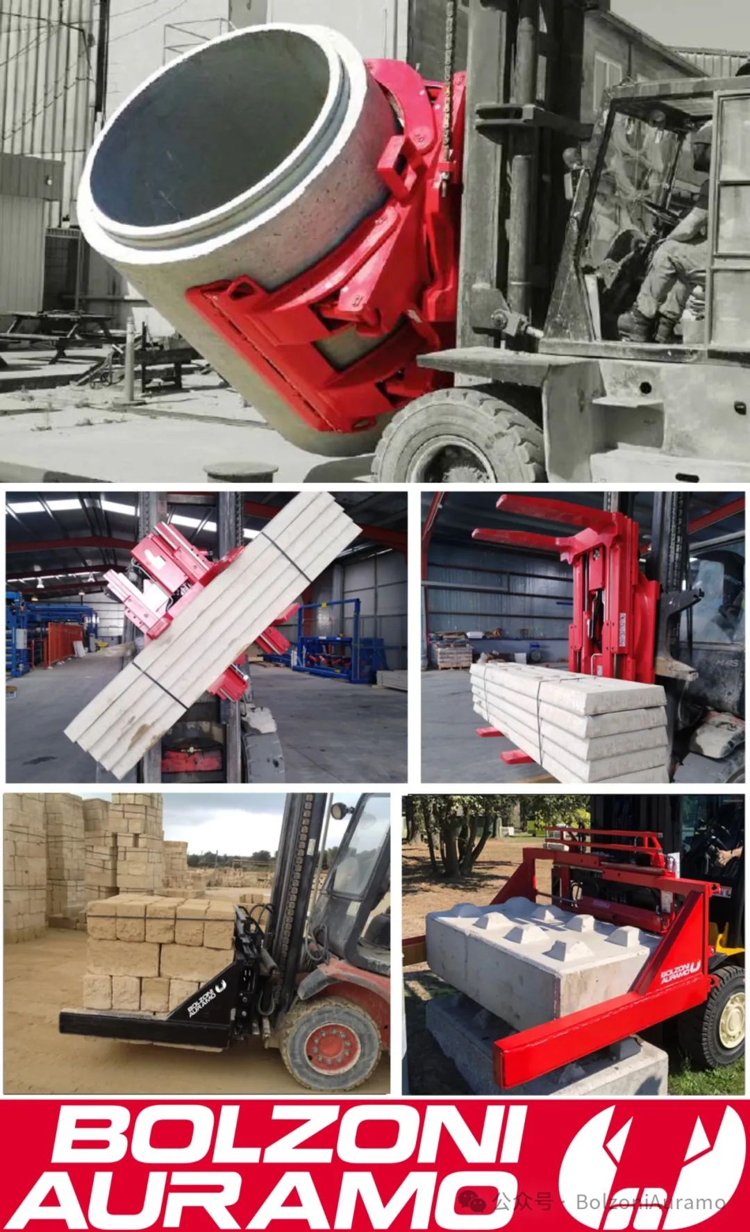 博索尼奥拉茂(Bolzoni Auramo)属具可应用于搬运建筑材料,如水泥、工程砖、水泥砖、块状铺砌、水泥管、超大结构、预制混凝土产品以及路缘石。