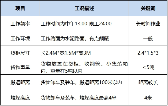 陆运物流中转站涉及货物装卸、货物转运、货物存储、货物分拣和配载等多个环节,每个环节都有严格的时间限制。因搬运货物种类复杂多样、搬运时间严格限制,故其应用叉车搬运货物不仅要保持高效率,还要确保搬运过程中不损坏货物。主要面临以下工况特点: