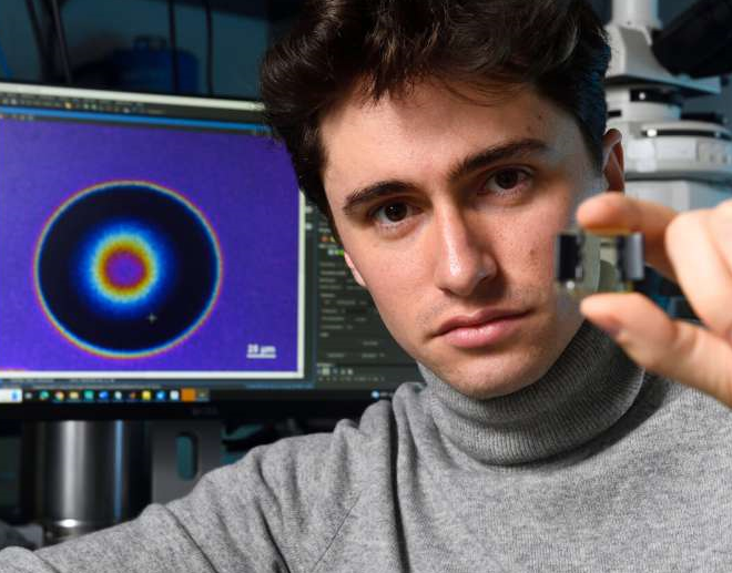 阿尔文-莫丁(Alvin Modin)在克里格艺术与科学学院实验室与液晶装置合影。图片来源:Will Kirk/约翰霍普金斯大学。