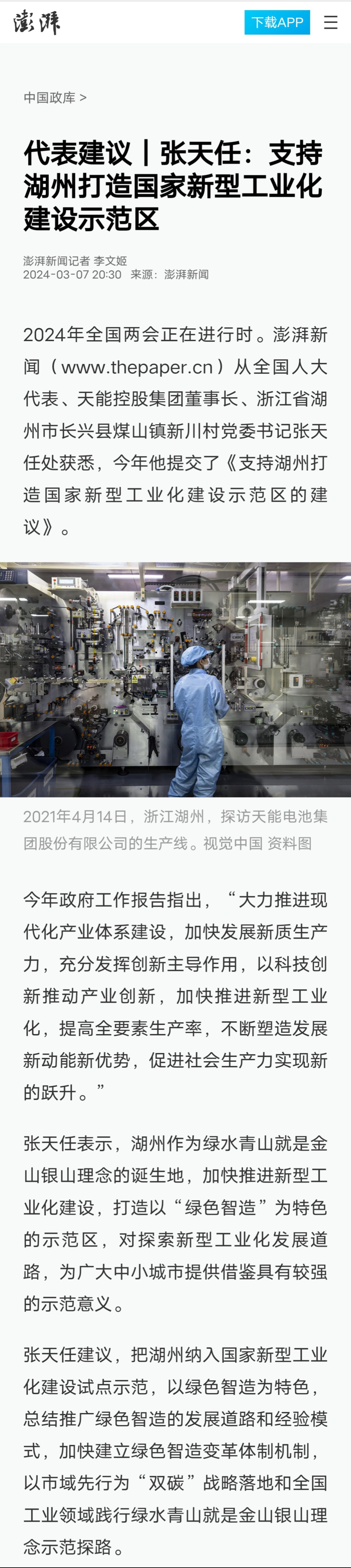 全国人大代表、天能控股集团董事长、新川村党委书记张天任结合区域优势,围绕支持浙江打造民营经济总部高地、湖州打造国家新型工业化建设示范区,提交2件建议,助力区域经济发展,受到经济网、澎湃新闻的关注。
