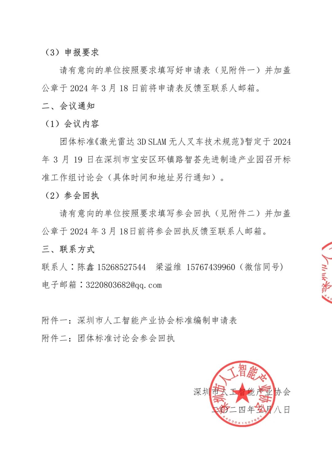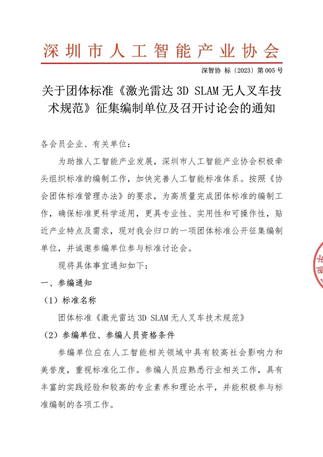 由深圳市镭神智能系统有限公司(以下简称”镭神智能“)牵头、深圳市人工智能产业协会组织的关于团体标准《激光雷达3D SLAM无人叉车技术规范》的工作讨论会,将于3月19日在深圳市宝安区环镇路智荟先进制造产业园举行,此次讨论会旨在推动激光雷达3D SLAM无人叉车技术的标准化和规范化发展,加快完善人工智能标准体系。