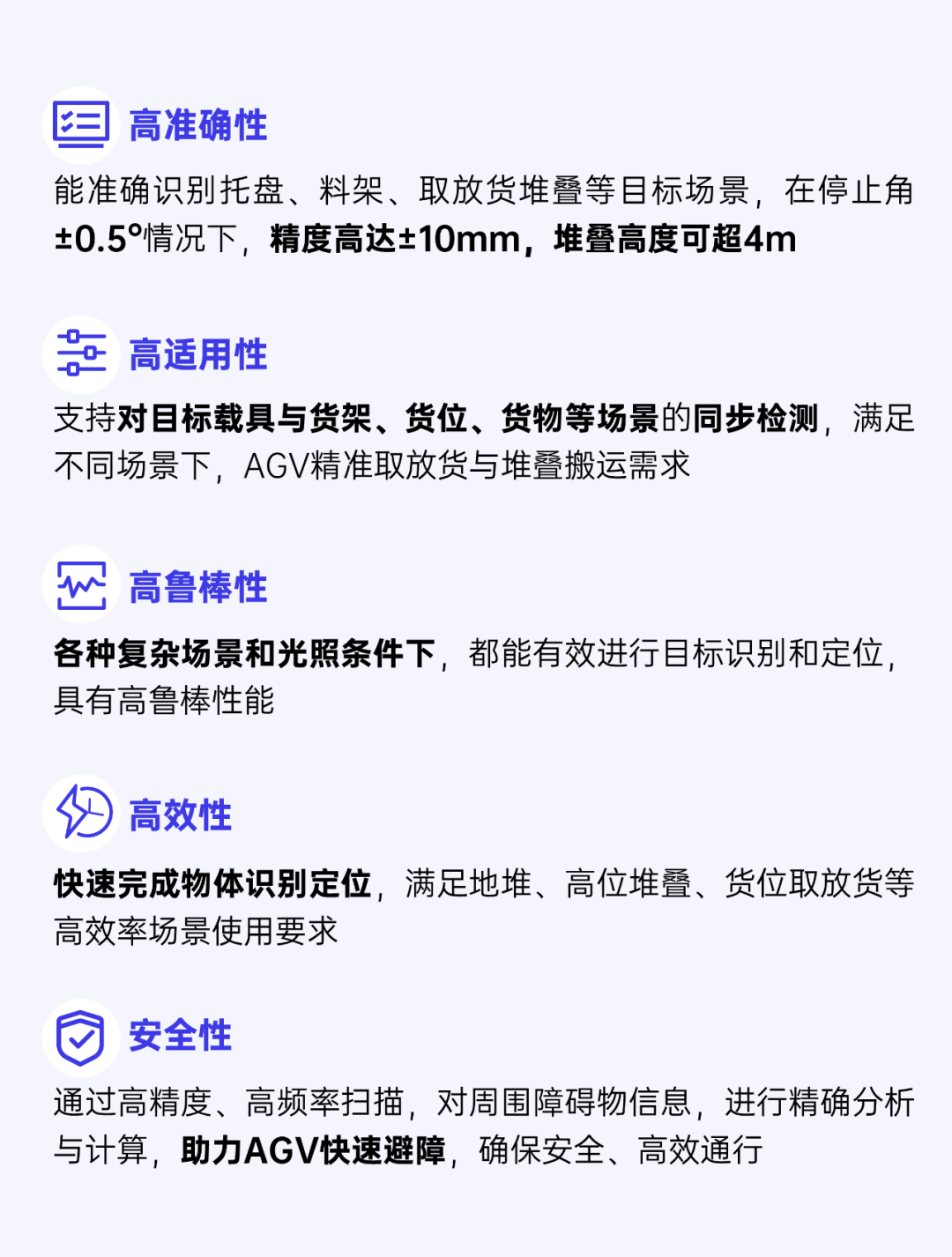 货架取放货,特别是高层货架,对取放精度和安全性要求很高。对此后向感知技术,基于先进传感器对场景进行扫描,通过识别货架关键特征,生成货位是否有货及取放货位姿信息,保障AGV高效取放货。