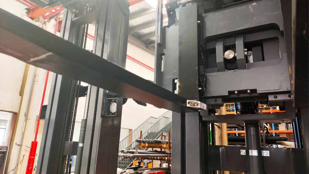 双伸位叉车可负载1.5T的货物,在货叉处还配备了高清无线摄像头,无论空载/满载、高位/低位,驾驶员都能“零距离”清晰观察库位、托盘位置,避免误操作产生撞击,危害人身、财产安全。