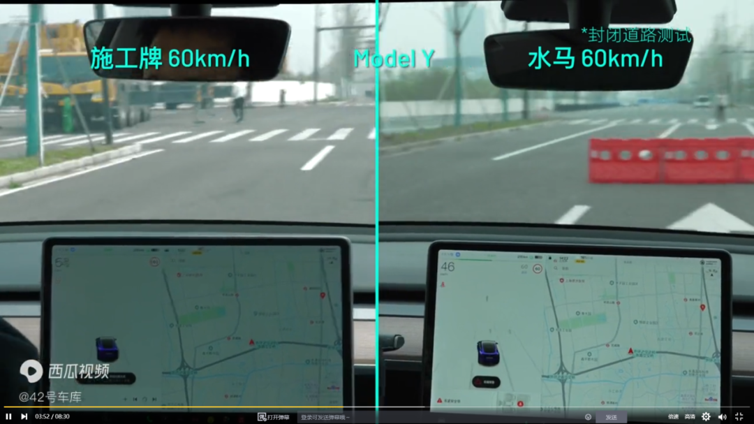 白天路面障碍物测试中,纯视觉视觉+毫米波雷达车型和带有激光雷达的车型之间的表现差异明显。当车辆以时速60km/h行驶时,纯视觉视觉+毫米波雷达车型因为无法及时识别障碍物直接撞上了施工牌与水马。导致这一事故的根本原因有两点: