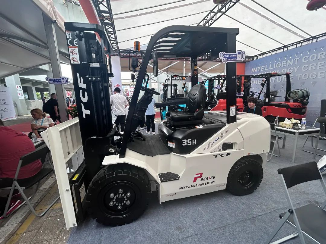 TCF重磅新品C系列2.5吨短轴距锂电叉车,同样获得了现场客户的高度关注,它具有灵巧精悍、安全高效、随充随用等优点。搭载宁德时代磷酸铁锂电池,先进的三电热管理系统使得它在-30℃~60℃依然能正常启动和作业。1950mm的小转弯半径设计,能在密集仓储场景穿梭自如,广泛适用于电商、食品、药品、制造业等物流搬运场景,大大降低了人工作业强度。