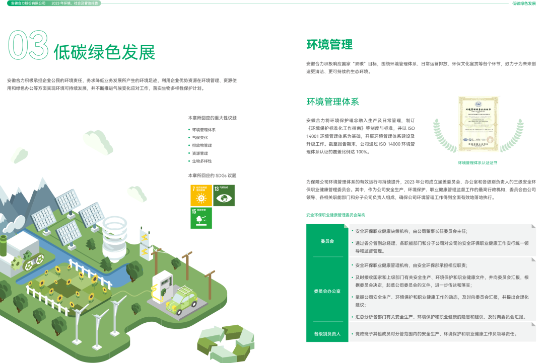 为提升可持续发展工作管理水平与履责能力,合力充分构建面向ESG全面管理的治理体系,建立了“董事会战略委员会—ESG管理委员会—ESG管理执行小组”三层级的ESG管理架构,并设立ESG管理办公室,推进落实ESG管理工作。2023年,公司全方位贯彻统一的可持续发展工作步调,努力推动价值创造、价值共生、价值共享。报告全面呈现公司在环境保护、社会责任和公司治理方面的生动实践。