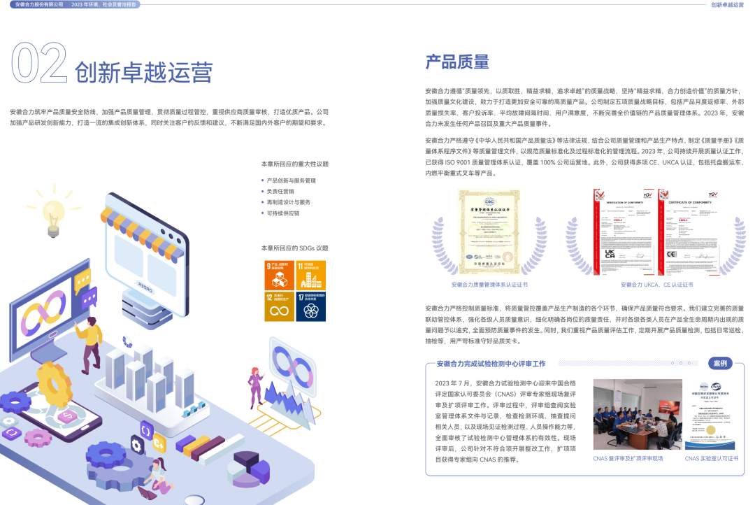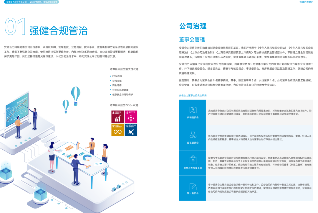 近日,合力发布《安徽合力股份有限公司2023年ESG报告》。这是合力连续发布的第16份可持续发展/社会责任报告,也是首份覆盖主要利益相关方及重大性议题的ESG报告,并于中国工业车辆行业率先发布可持续发展战略。