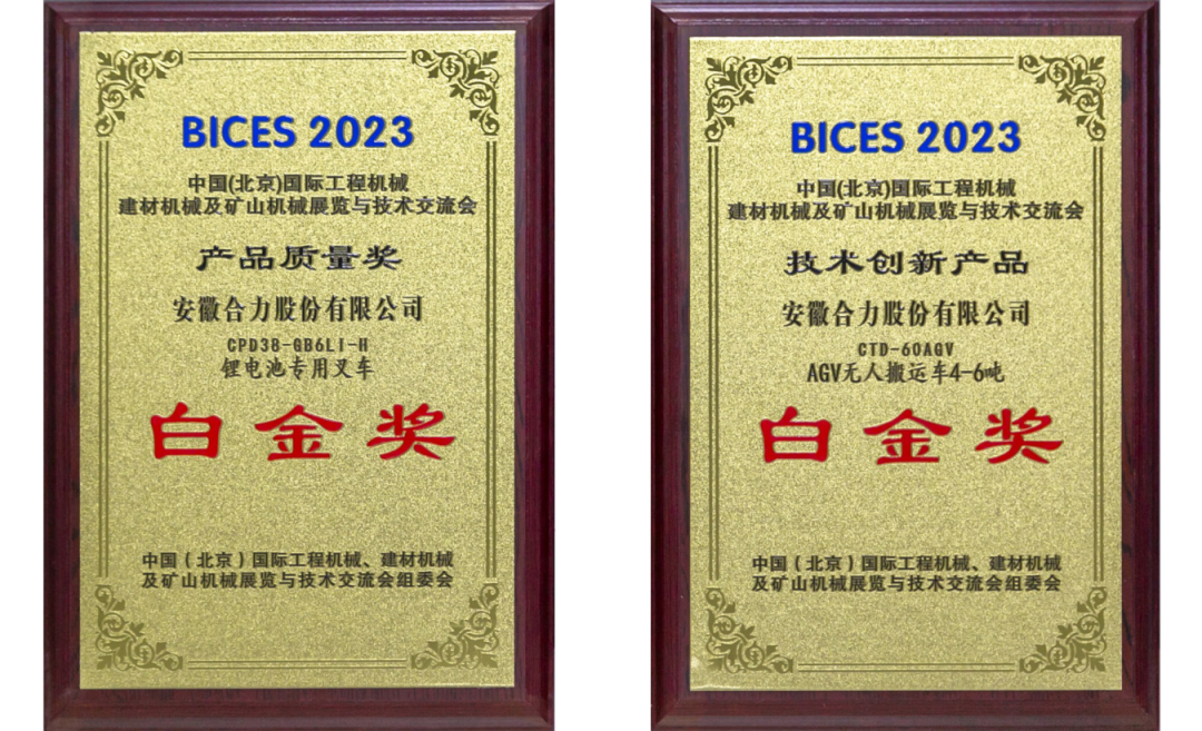 会议期间,还隆重举行了“BICES 2023工程机械产品质量奖、用户满意奖、技术创新奖”颁奖仪式,合力CTD-60AGV无人搬运车、CPD38-GB6LI-H锂电专用叉车2款产品凭借领先的技术优势、过硬的产品品质在评选中脱颖而出,分别荣获组委会最高等次奖项——技术创新“白金奖”和产品质量“白金奖”殊荣。此次获奖不仅是对公司技术创新、产品质量的高度认可,更是对合力在推动行业技术进步、引领产业升级方面所作贡献的赞誉。