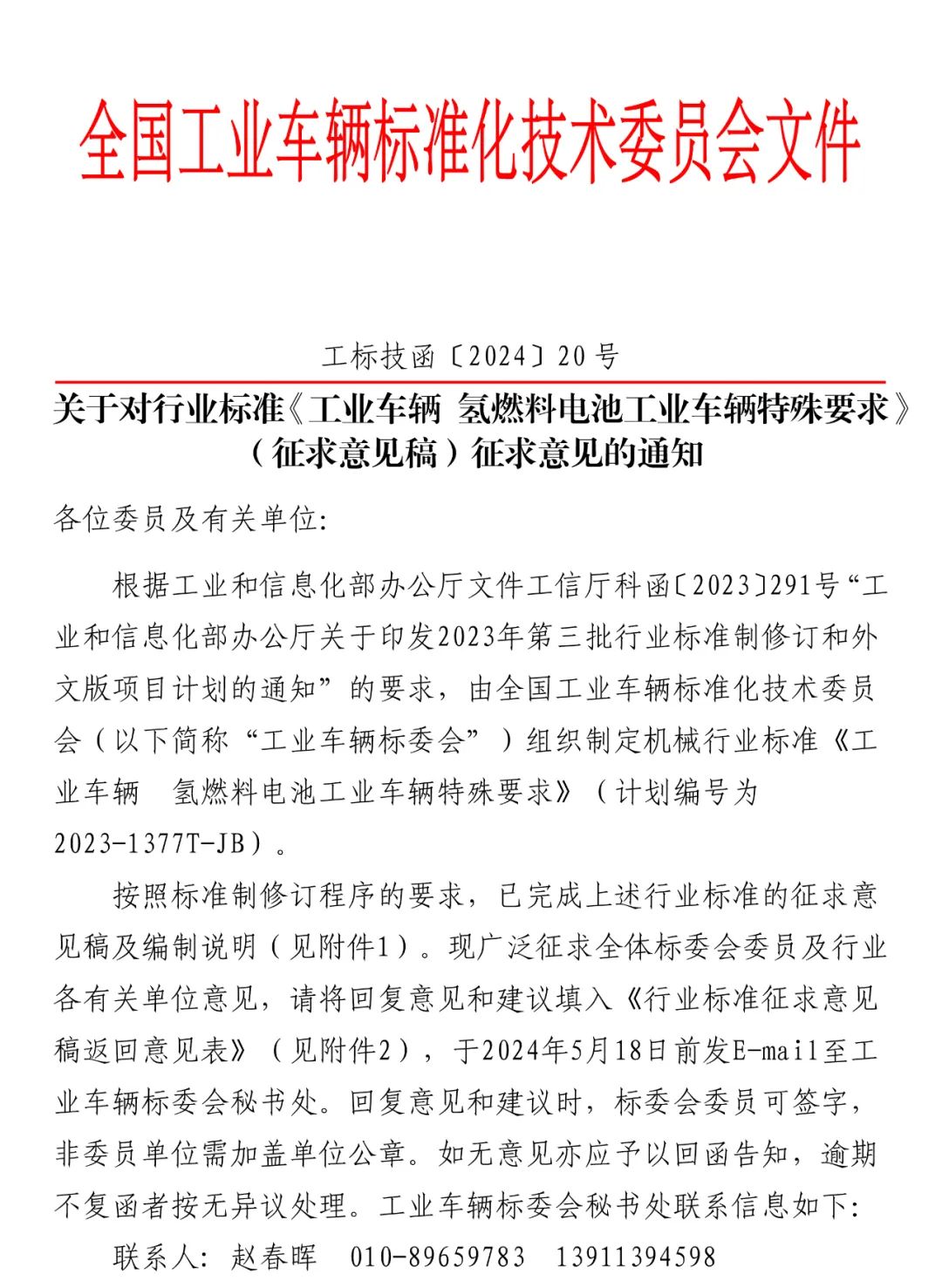 关于对行业标准《工业车辆 氢燃料电池工业车辆特殊要求》(征求意见稿)征求意见的通知