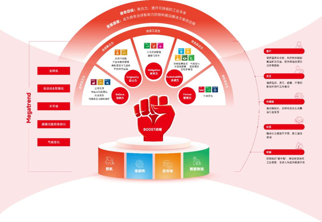 2023年,合力全面加快构建具有自身特色的ESG管理与实践体系。公司积极响应联合国可持续发展目标,充分识别和剖析当前全球趋势动力,融合公司发展战略和业务定位,制定了公司可持续发展战略“BOOST”,统一全公司对于践行可持续发展理念的意识与步调,确立了“聚合力,提升可持续的工业未来”的使命目标和“成为具有全球影响力的物料搬运解决方案供应商”的发展愿景。
