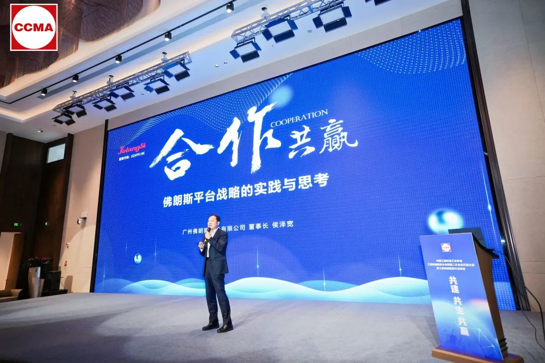 在经济全球化与产业智能化交织的时代背景下,中国工程机械租赁行业正迎来新的发展机遇。4月26日,中国工程机械工业协会工程机械租赁分会隆重举办了以“共建、共生、共赢”为主题的四届二次会员代表大会暨工程机械租赁行业峰会,政府领导、协会领导、分会理事单位及会员单位代表、制造商、代理商、中外优秀租赁企业等齐聚一堂,共同探讨行业的高质量发展之路。佛朗斯股份董事长侯泽宽先生应邀出席本次峰会,并发表了主题为“合作共赢—佛朗斯平台战略的实践与思考”的演讲。