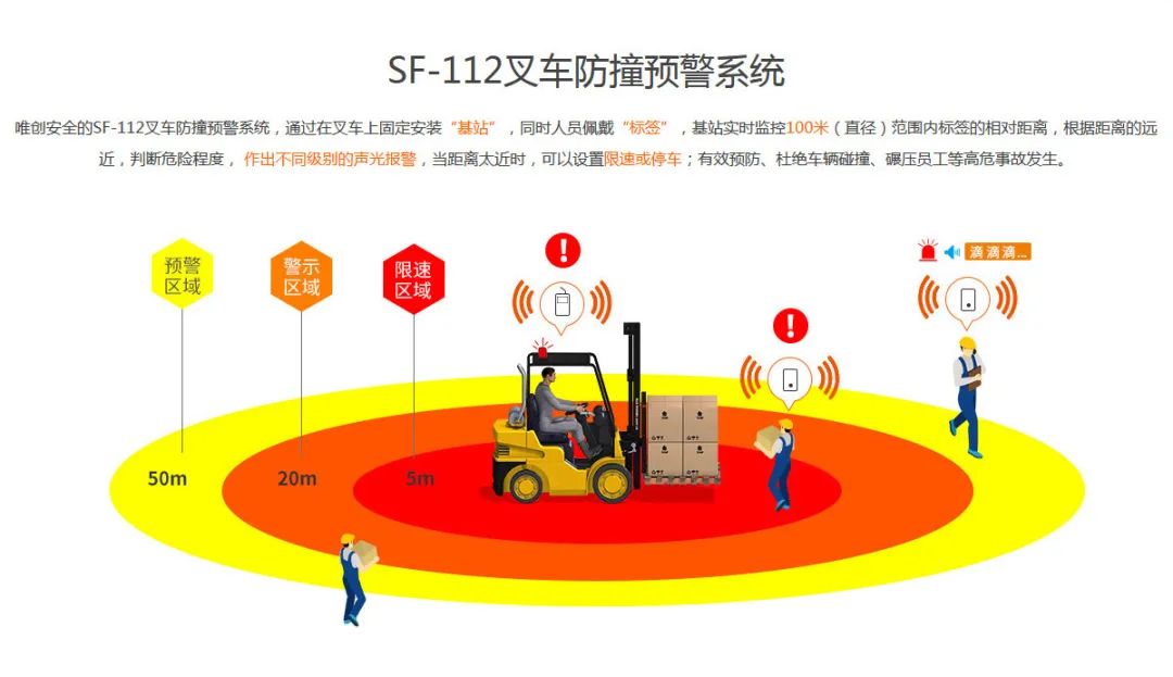 通过SF-112叉车UWB测距防撞预警系统,让所有的叉车具备对闯入危险区域的人员实现精准预警,有助于缓解困扰仓储物流多年的人机交互装卸现场环境中“ 叉车吃人”的安全管理难点,使叉车撞人事故得到遏制,守护厂区人、车、物安全。