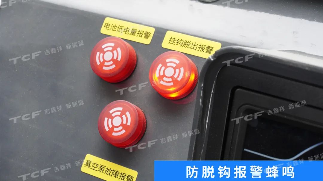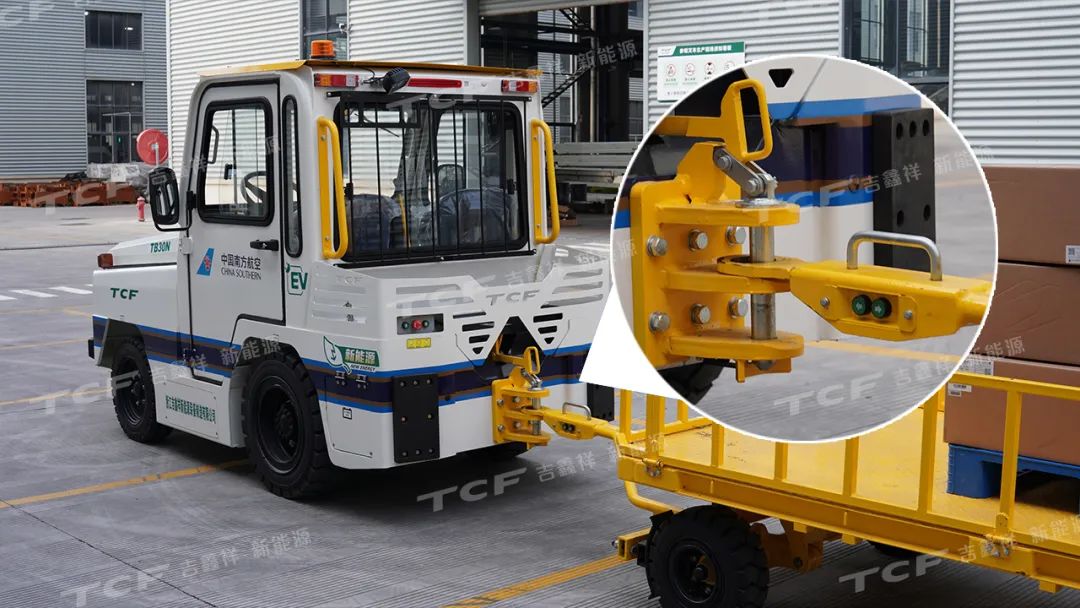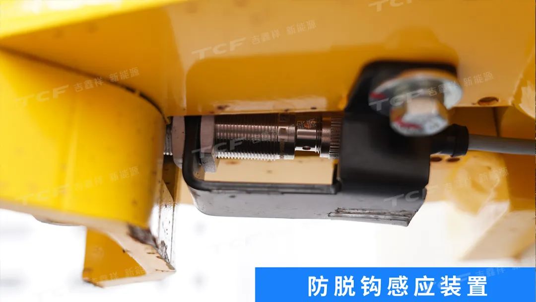 TCF牵引车后牵引座配备了双重机械锁止结构和脱钩报警功能,这种设计能有效预防失误操作引起的牵引栓脱出,如果牵引栓在车辆运行时意外脱出,驾驶室内的声光报警装置会发出报警,提醒驾驶员采取措施,同时车辆自动减速,为货物和人员的安全提供了双重保障。