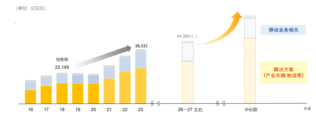随着2030年企业愿景发布,为打造更适宜居住的生活、更丰富的生活和更温暖的社会做出贡献,丰田集团将持续提供以顾客需求为先的商品和服务,以支持世界产业和社会基础。与此同时,集团的销售也因此稳定提升中,计划于2026-27年左右整体销售额达到4兆4000亿日元以上。