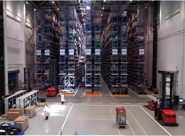 在该项目中,林德充分利用了物流中心高架库中的每一寸空间,提供的窄通道叉车提升高度达到16.2m(最高可达18.1米),能在极窄的巷道里自由穿梭。