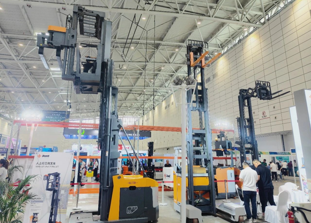 我司本次主要展出设备有窄巷道三向AGV叉车及人上行三向叉车、全向前移式叉车及双伸位剪叉车。