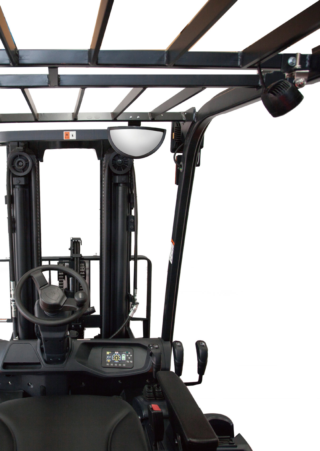 山猫叉车优化门架链条和整体结构布局,前方视野更开阔,降低前围板高度,减少视觉盲点。优化顶部防护装置厚度和布局,视野更开阔。