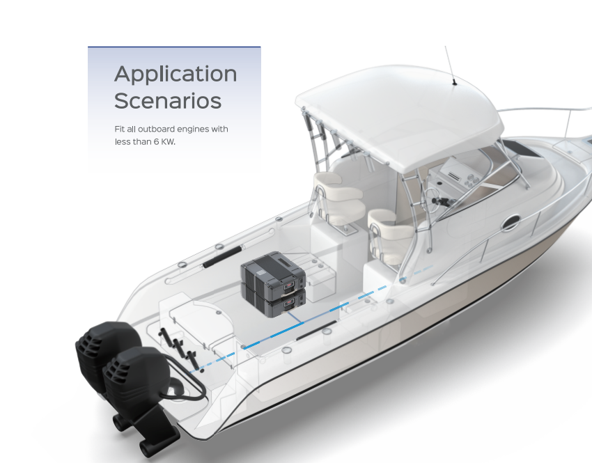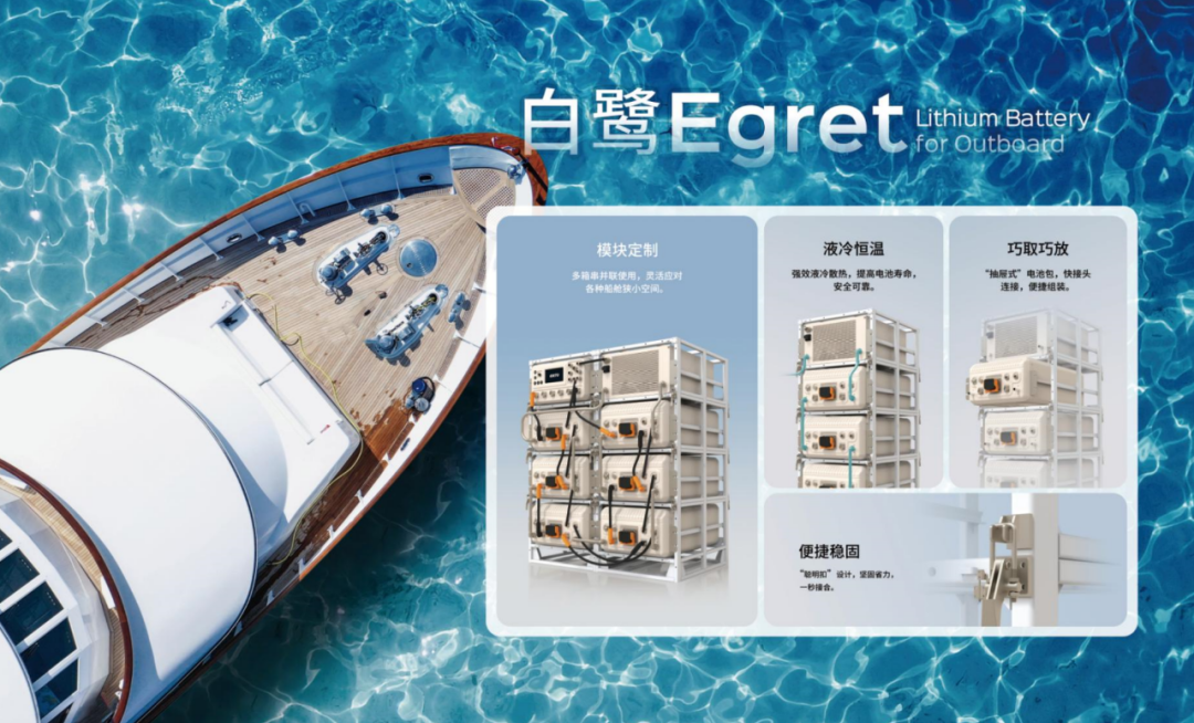 在小型艇应用方案上,益佳通电池展出的飞鸥船舶舷外机动力电池尤为引人注目。这款电池不仅有灵活小巧的拉杆箱外形设计,还能够灵活堆叠,可适配6kW以下所有的舷外机系统。