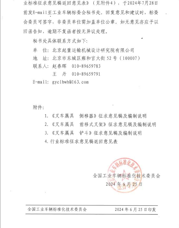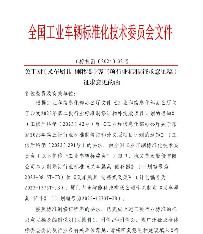 关于对《叉车属具 侧移器》等三项行业标准(征求意见稿)征求意见的函