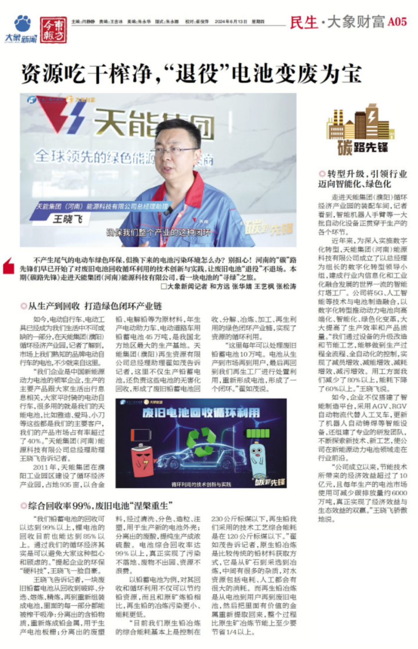 6月13日,“大象新闻”刊发《资源吃干榨净,“退役”电池变废为宝》的报道,介绍了天能濮阳公司加快智能制造转型升级,从生产到回收,打造绿色闭环产业链,综合回收率99%,让废旧电池“涅槃重生”的典型案例。