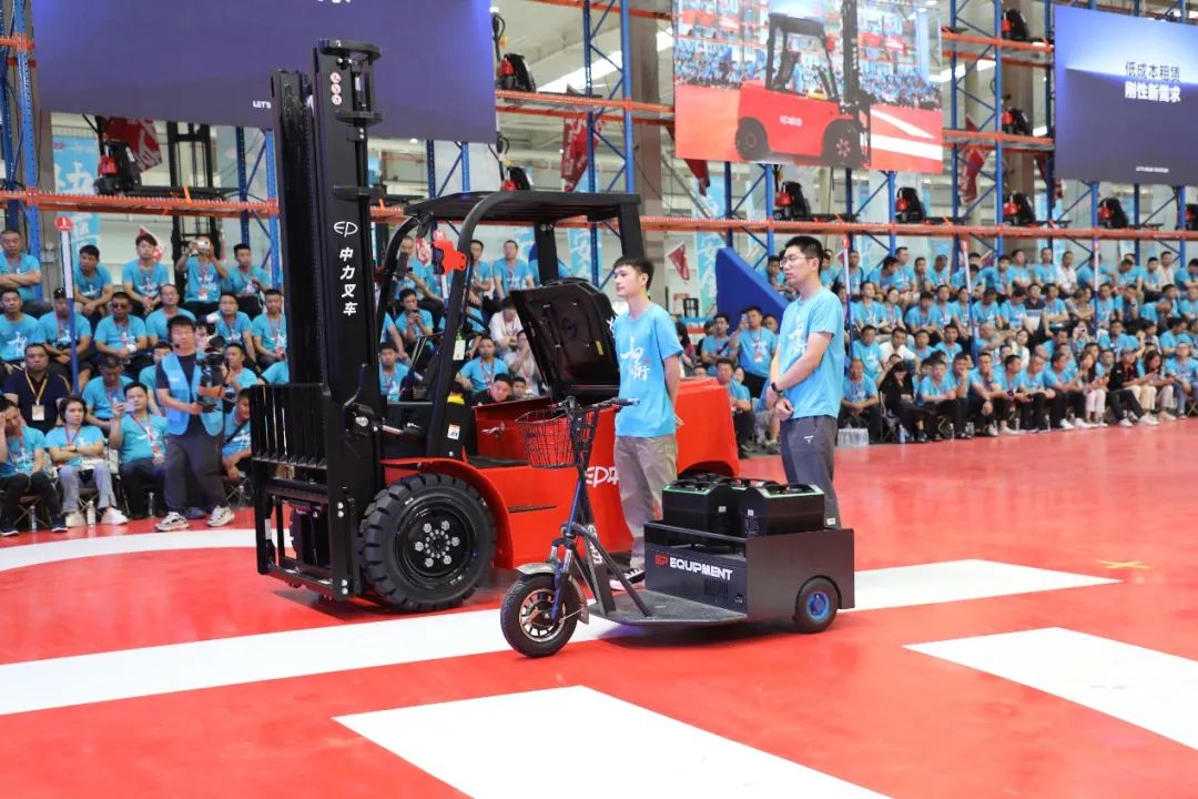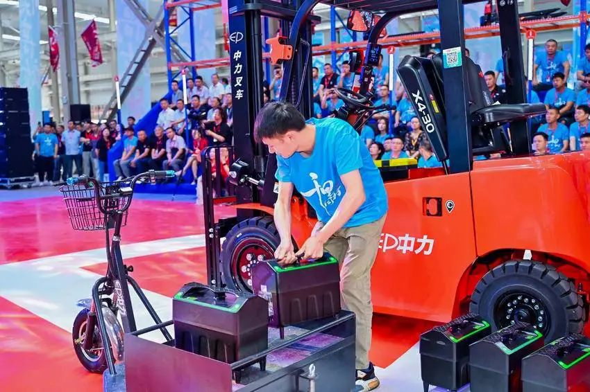 中力多年前首次提出了“油改电”的概念,旨在推动叉车行业向更环保和高效的方向发展,减少内燃机叉车的使用,转向电动叉车,从而降低碳排放和运营成本。经过多年的持续创新和努力,中力在本次629活动现场展示的“油改电”创新举措和方案,受到在场嘉宾的高度赞赏。中力再次突破想象,针对部分不能充电场所如物流园区,中力创新推出可手提换电的油改电锂电叉车,多容量电池自由组合,满足园区多种工作时长需求。一主多从电池设计,维护简单,工作人员手提即可更换,快速充电补能。