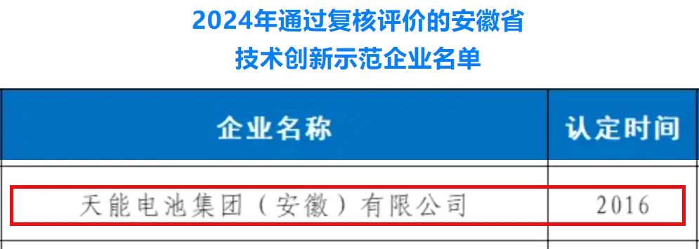 近日,安徽省工信厅发布2024年安徽省技术创新示范企业复核评价结果,天能界首公司通过复核认定。