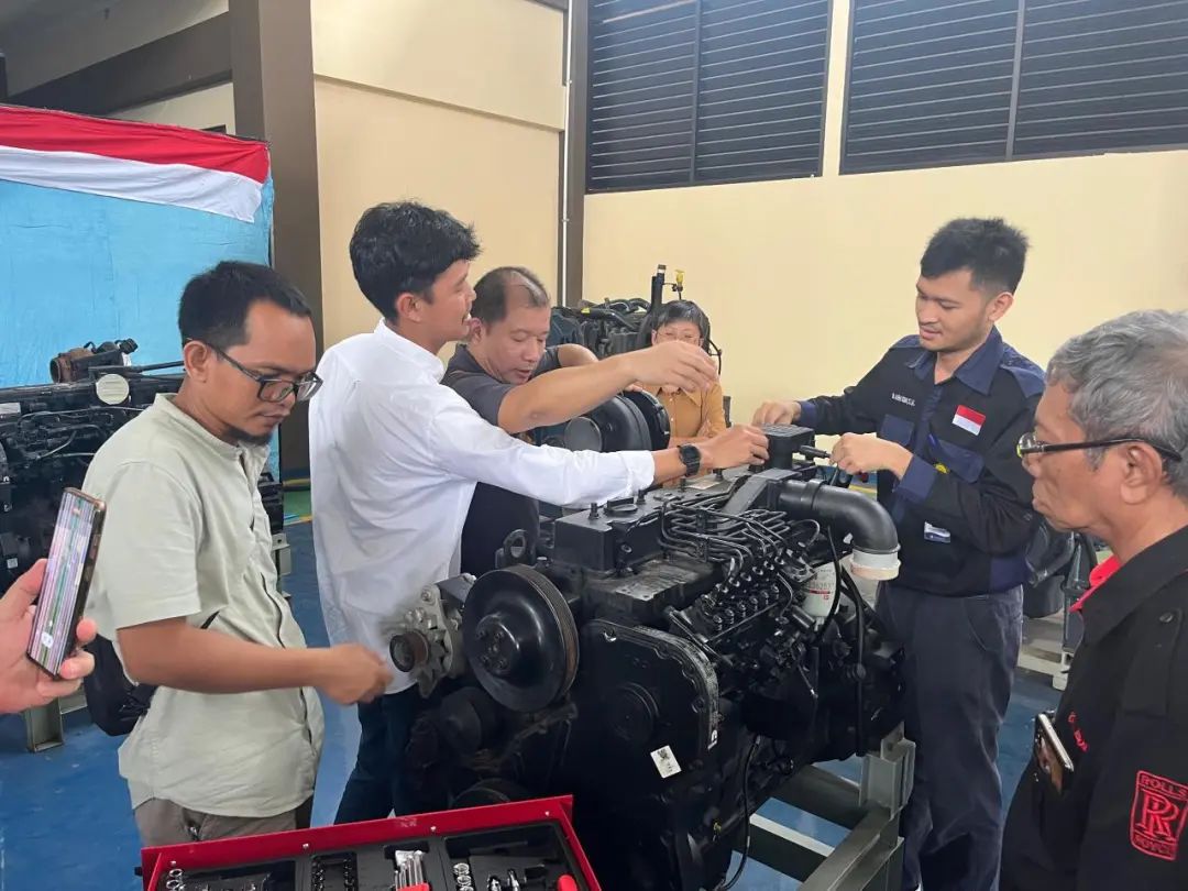 柳工与柳州职业技术大学派出专业培训团队,对POLSRI大学的18名教师进行了为期数周的TTT(Train the Trainer)培训和认证,培训内容不仅包括发动机、变速箱、驱动桥等核心部件的结构和工作原理,还有实际操作和现场演示等。培训团队采用引导文教学法和项目教学法,结合动态可视化教材使培训过程更生动、易理解,进一步提高培训的参与度和效果。
