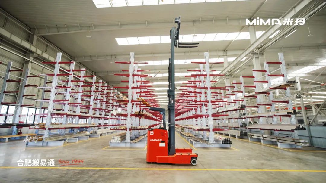 2、为了满足长重物料的灵活搬运需求,建议客户采购并使用MiMA米玛窄体全向叉车MQ25,这款叉车额定载荷2.5吨,拥有多种行驶模式,侧行通道更小,能够完美适配窄巷道作业环境。
