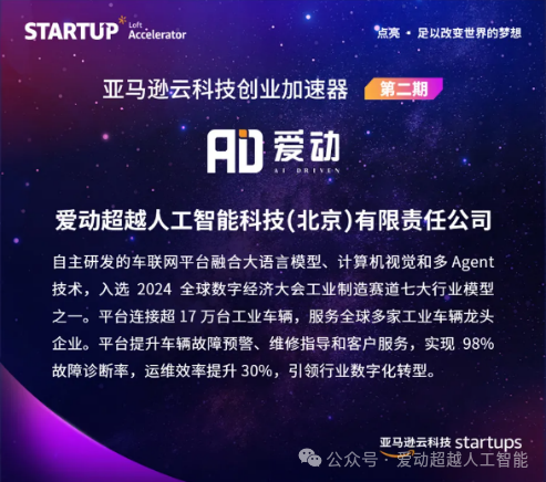在全球化的浪潮中,技术的力量不断推动着各行各业的革新与进步。我们荣幸地宣布,爱动超越凭借在车联网大模型应用层的创新成就,已成功加入亚马逊云科技创业加速器第二期(生成式 AI)。爱动超越将作为车联网大模型、计算机视觉和多 Agent 技术应用层公司代表,与其他入选的30家初创企业共同参与为期10周的课程赋能,完成与亚马逊云科技全球创投网络和业务拓展等资源的全方位对接。