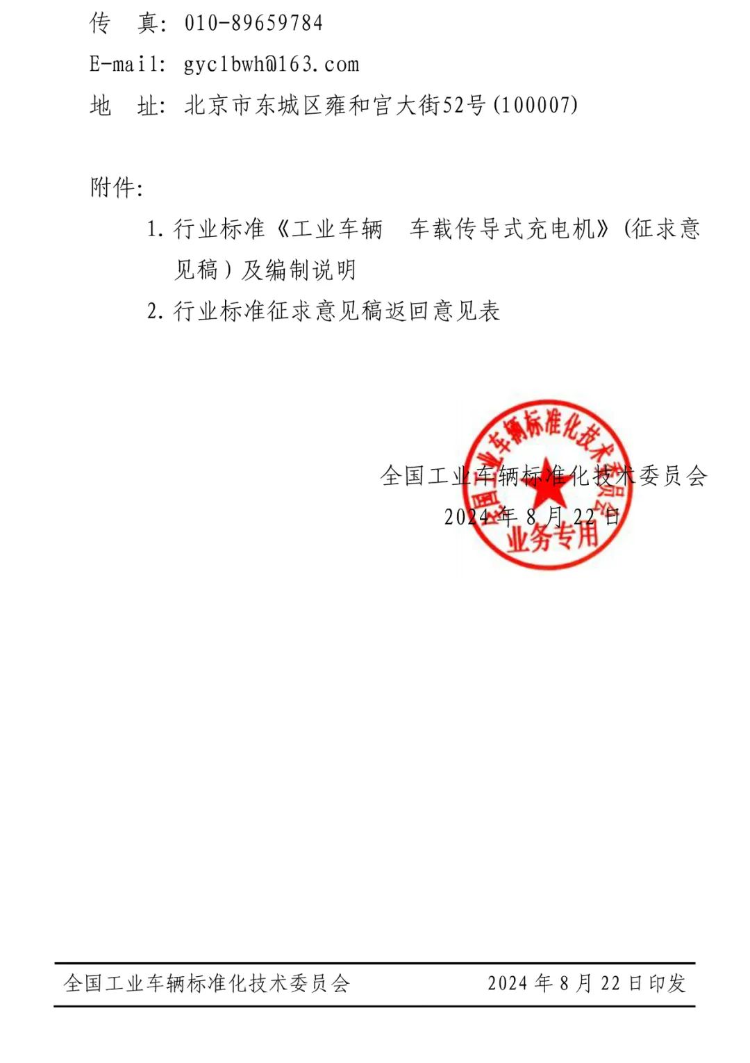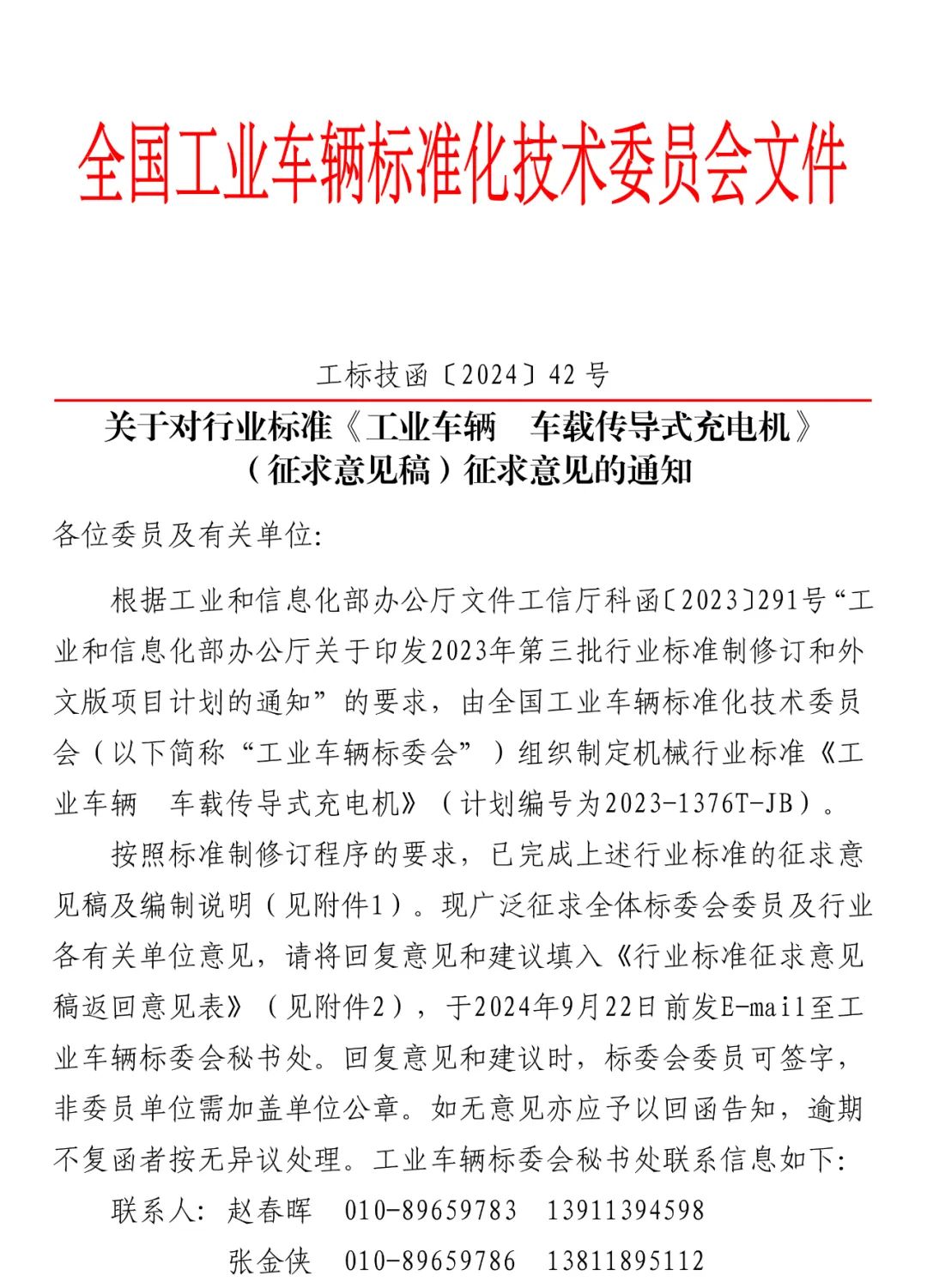 关于对行业标准《工业车辆 车载传导式充电机》(征求意见稿)征求意见的通知