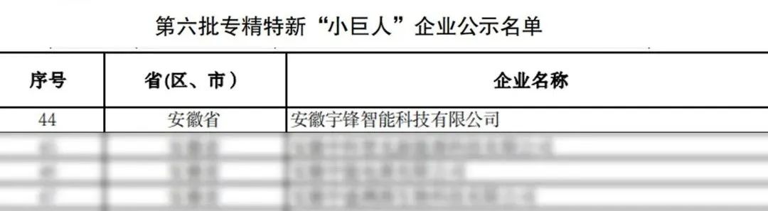 近日,第六批国家级专精特新“小巨人”企业名单公示,宇锋智能凭借卓越的创新能力和显著的市场竞争力成功入选国家级专精特新“小巨人”企业。